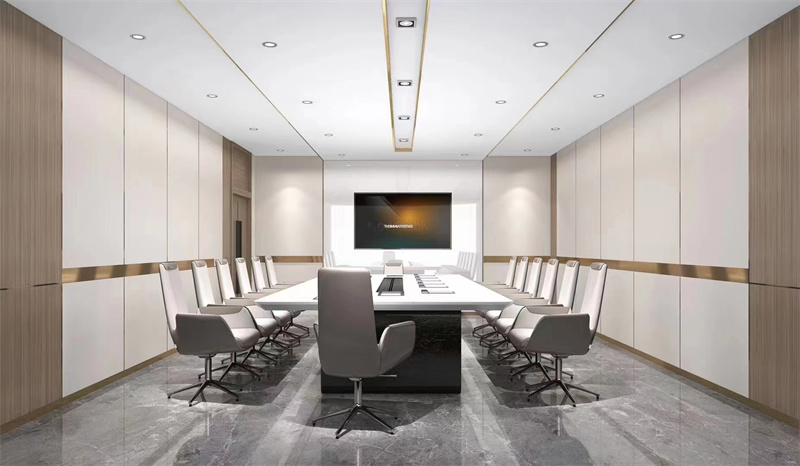 在裝修辦公公司時,會議室空間布局上位置可以離入戶口比較近,一來客戶進入公司后,可以很快的進入研討,二來也不會被來來往往的外邊人員頻繁地走動,影響會議的效果。如果業(yè)主希望既能保障會議室的隱私性,又想要空間透光性好。我們可以設(shè)置鋼化玻璃、石膏板隔斷里加隔音棉,與戶外窗戶的采光相結(jié)合,或者碰巧會議室所在的位置沒有窗戶,我們可以用霧化玻璃來給空間多一點“呼吸”。不同的色彩給人的感覺是不一樣的。會議室是需要經(jīng)常談判、開會的地方,對于不同的企業(yè)會議室的風格和色彩也是千差萬別的。傳統(tǒng)的會議室過于的壓抑和沉悶,同時還影響著整個談判場合的氣氛。但隨著更新?lián)Q代,我們常看見的金融類的企業(yè)不再是以深色為主,而是以暖色作為會議室的基調(diào),顏色就相比較內(nèi)斂一些,木色為主,金色為輔的格調(diào)。而科技類的會議室主要色調(diào)以藍色調(diào)為主,也是企業(yè)的主色調(diào),但是大多數(shù)企業(yè)主要是現(xiàn)代簡約商務(wù)風格,會議室設(shè)計主要還是以高端,大氣,質(zhì)感為主。