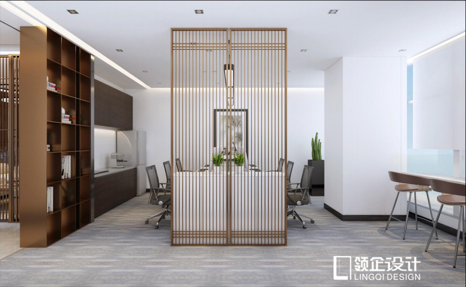 在走道的處理上,由于原走道較長,為了突出舒適建筑開間的優勢,特別設計了一個裝修主題,在走道的柱子和玻璃幕墻上的磨砂條之間嵌入不銹鋼條。同時地面用馬賽克緞帶打破,與方正美觀的天花板相呼應。在辦公室走道附近的墻面上,為了讓自然光透入走道,加強其“通透”感,采用了通透的玻璃幕墻。幕墻上的磨砂條不僅打破了玻璃墻的剛性,還能提醒行人幕墻的存在,防止無意識的相遇、碰撞等類似事故。為了辦公室后續的私密性,其通透的玻璃幕墻可以裝上百葉窗。